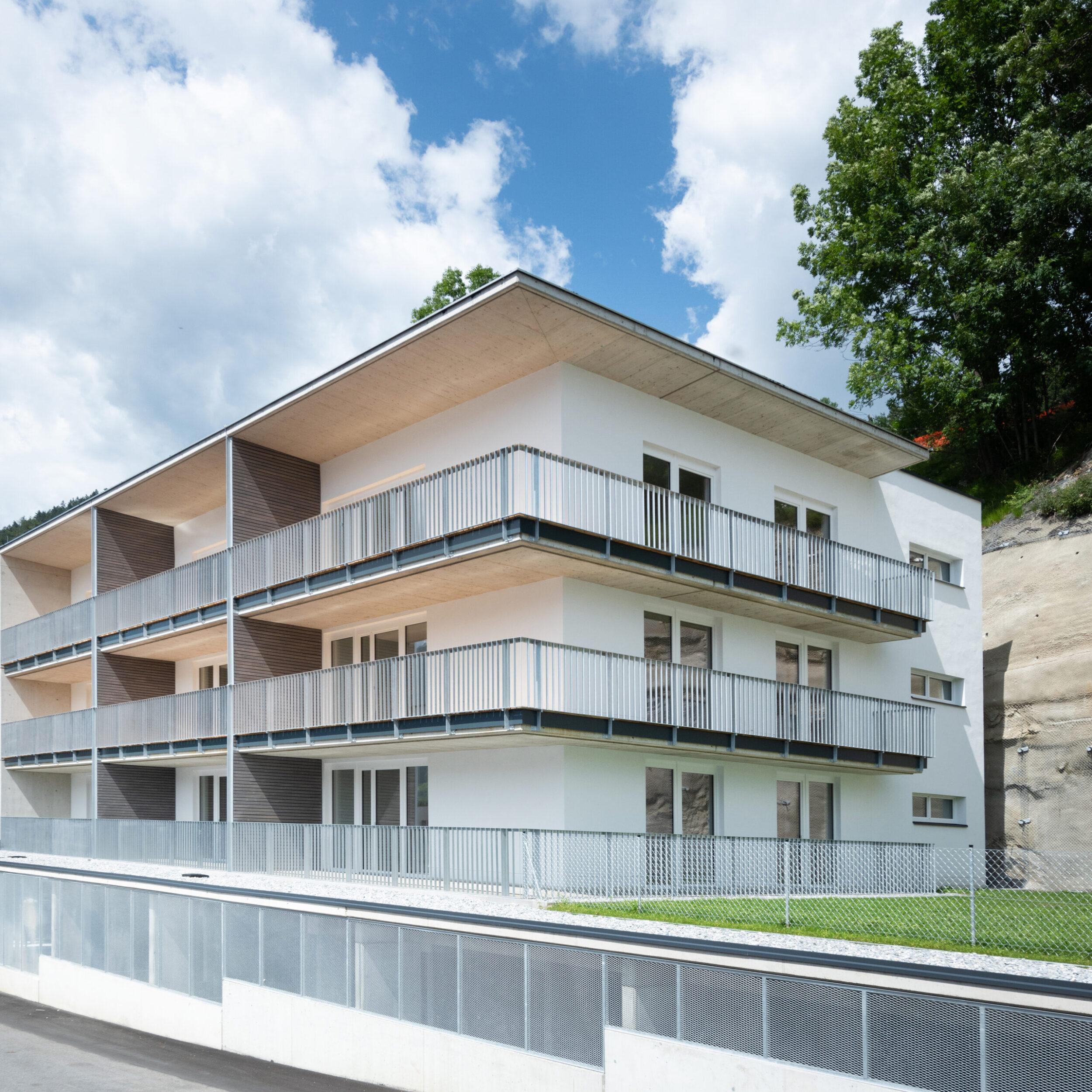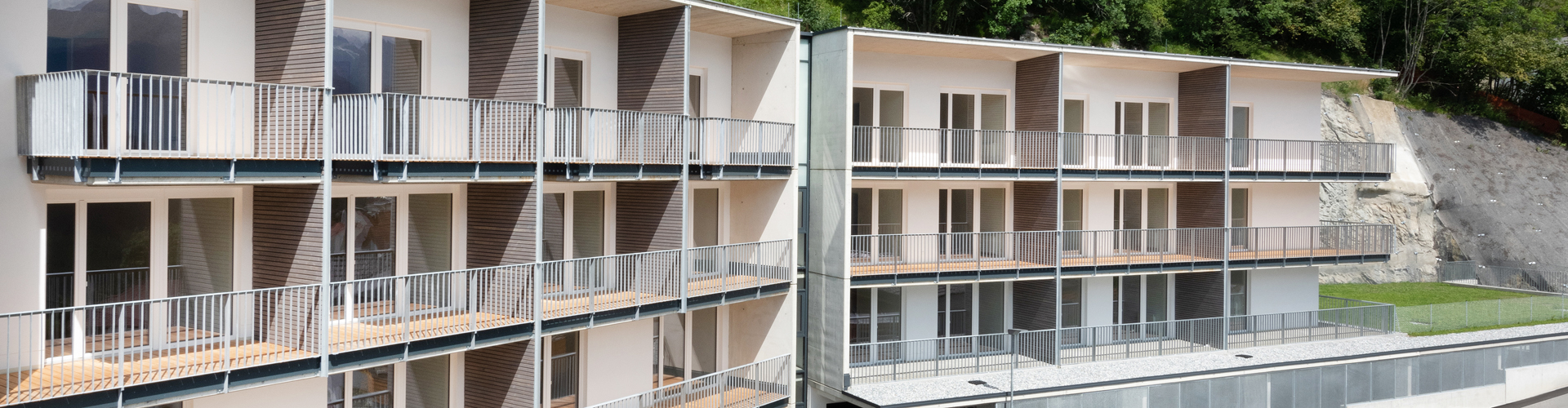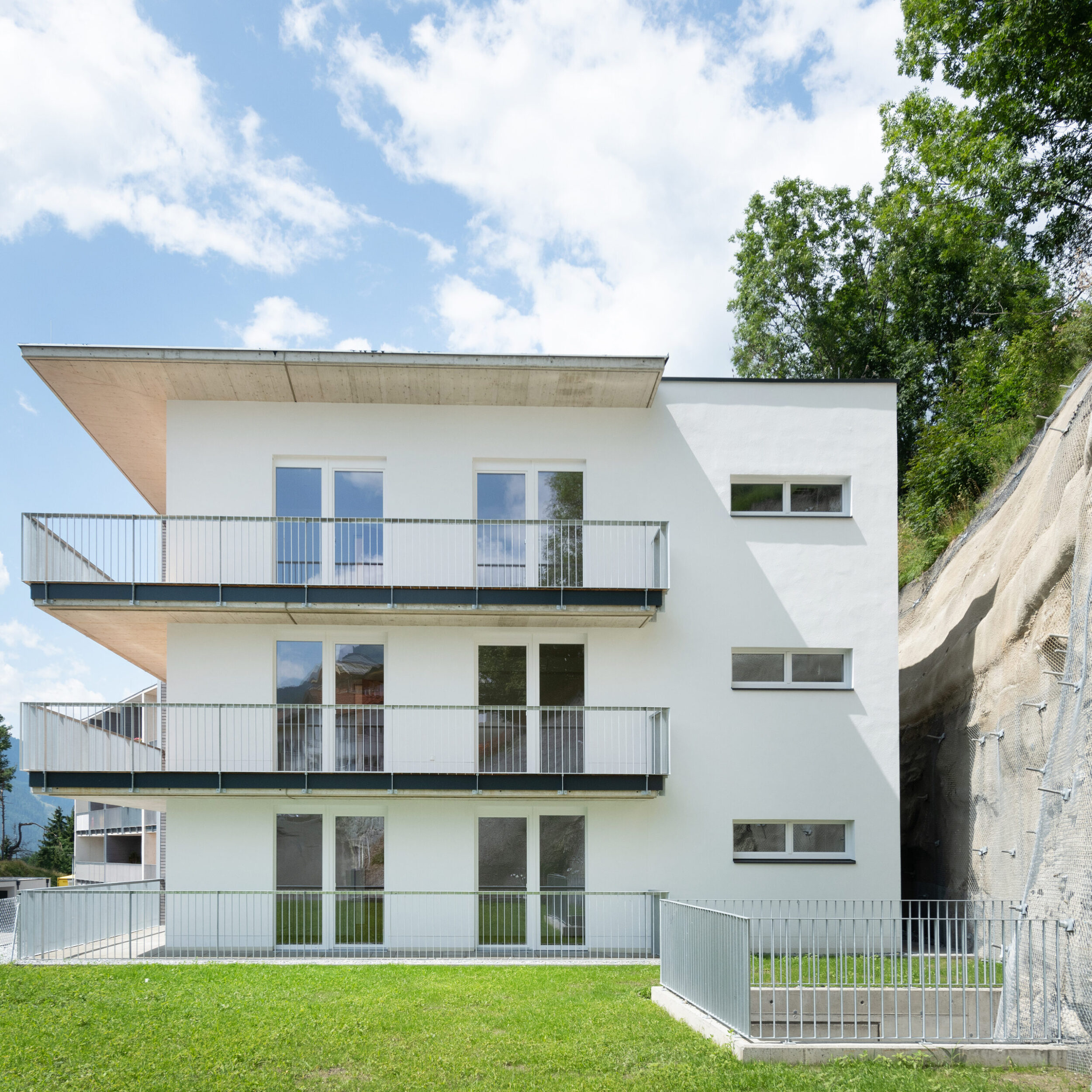 Auf der Garage entstand ein allgemein zugänglicher Dachgarten. Alle Wohnräume und Balkone sind zur Sonne orientiert und bieten einen weiten Panoramablick ins Tal.
