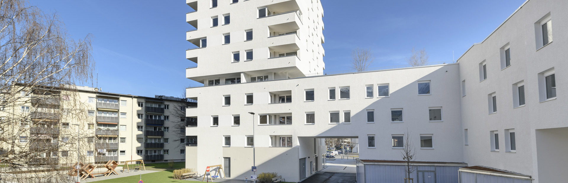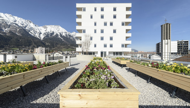 Die NEUE HEIMAT TIROL errichtete im Zuge der Neugestaltung der alten Südtiroler Siedlung in Innsbruck, Pradler Saggen, im ersten Bauabschnitt eine moderne Wohnanlage mit 57 Mietwohnungen, einer Arztpraxis und Tiefgarage.