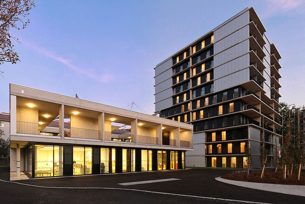 Die NEUE HEIMAT TIROL errichtete rund um die Pauluskirche ein Wohnhaus mit 70 Mietwohnungen sowie einen Kindergarten.