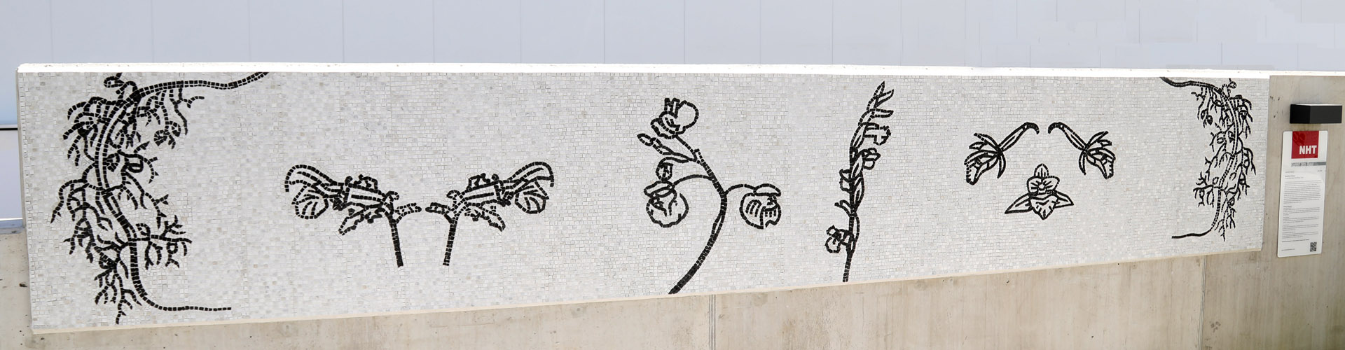 Motiv sind stark gefährdete Pflanzen, die im Naturschutzgebiet Söller Wiesen immer noch vorkommen. Das Areal bei Kundl zählt zu den Resten einst ausgedehnter Feuchtgebiete im Talboden des Inntals, wo zahlreiche vom Aussterben bedrohte Pflanzen und Tiere Lebensraum finden. Als Inspiration für den Mosaikentwurf dienten Holzschnitte aus dem 16. Jahrhundert, die Pflanzen in starken, dunklen Konturlinien darstellen. Wie frühe römische Mosaike ist das Werk in schwarzem und weißem Naturstein ausgeführt, wobei für Weiß Carrara Marmor sowie Quarzit und für Schwarz Granit verwendet wurde. Der Pflanzenfries besteht aus rund 30.000 handgesetzten, 1×1 cm großen Steinchen. Die geometrische Setzstruktur sowie das reduzierte Schwarz-Weiß des Mosaiks fügen sich harmonisch in die schlichte, von Weiß und Grau geprägte Gesamtanlage der Neuen Heimat Tirol ein.