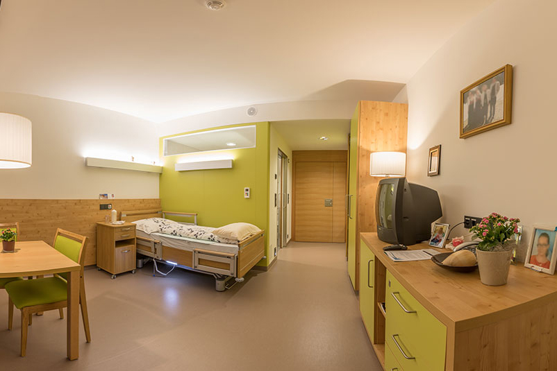 In den drei Obergeschossen befinden sich die Wohngruppen mit den 73 Pflegezimmern sowie die Tagesbetreuung. Jede Wohngruppe verfügt über eine Wohnküche, ein Dienstzimmer sowie eine Stube. Pflegebad sowie diverse Sanitärräume werden von den jeweiligen Wohngruppen gemeinsam genutzt. Im Außenbereich steht das „Bauerngartl“ als grüne Oase für die Bewohnerinnen und Bewohner zur Verfügung. Die gebürtige Innsbruckerin Carola Dertnig lädt mit ihrer Kunstinstallation O vor dem Sozialzentrum ebenfalls zum Verweilen ein.