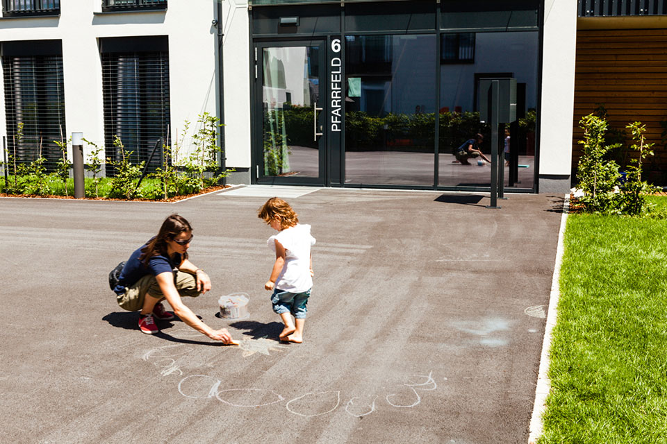 Die neue Anlage schließt im Nordosten direkt an die im Jahr 2016 fertiggestellten Wohnhäuser an und vervollständigt nun das mit vier Baukörper geplante Wohnquartier. Der Hofbereich bildet das Zentrum der Anlage mit Zugangswegen zu den Häusern und zum Spielplatz. Die Wohnhäuser weisen einen sehr niedrigen Heizbedarf auf. Die Versorgung erfolgt über eine Gaszentralheizung in Kombination mit einer Photovoltaikanlage am Dach.