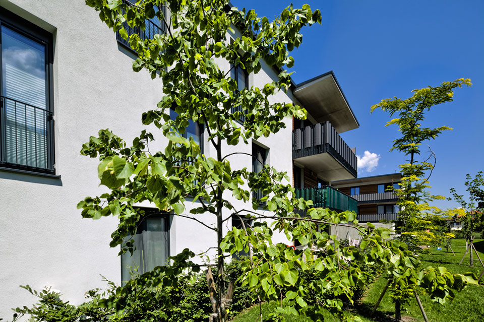 Die moderne Anlage wurde vom Innsbrucker Büro scharmer-wurnig–architekten geplant und besteht aus zwei Wohnhäusern mit elf bzw. zwölf Wohnungen.