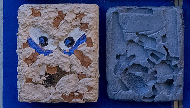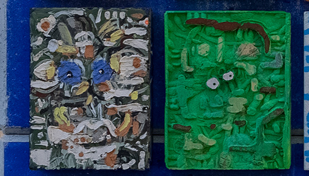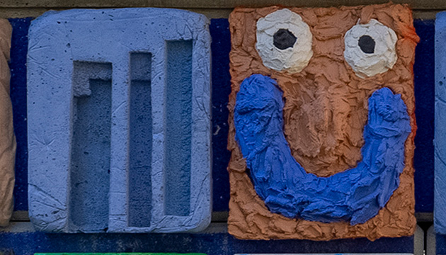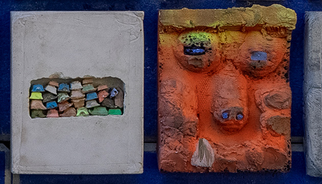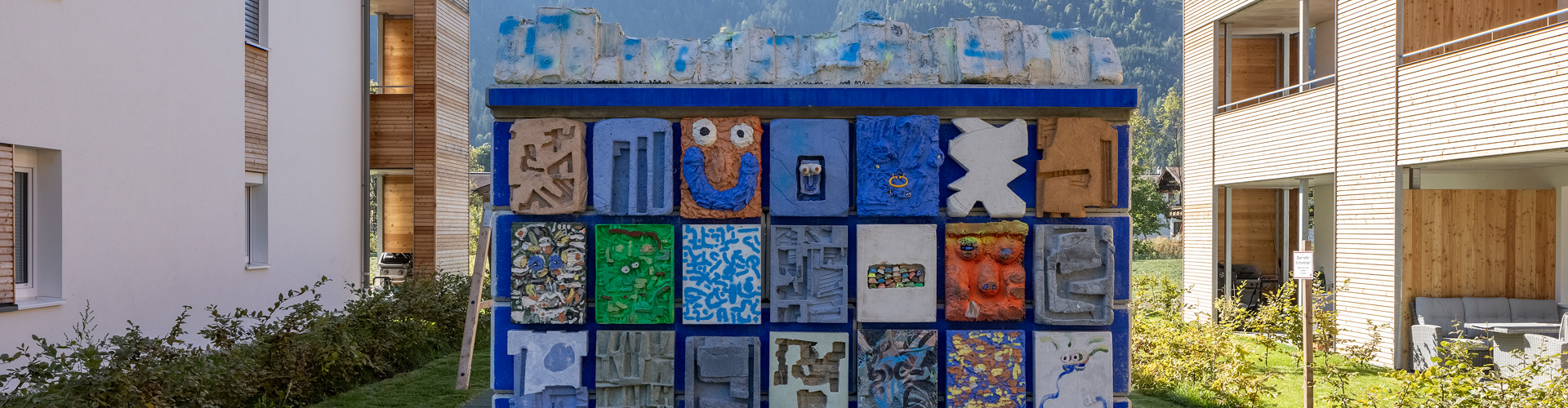 Die Rückseite des „Gidi-Blicks“ fungiert durch die reliefartigen Bildwerke quasi als Einladung, Identifikationsträger und Landmark für die gesamt Wohnanlage. Gleichzeitig schützt der lehnenartige Aufbau das Dahinter, trennt Spielplatz und Straße. Gidis Bildwand besteht aus Betontafeln und einer Keramikplatte. Jeder von uns hat diese eigenhändig gegossen, gefärbt und modelliert, anschließend passend kombiniert. Diese Technik war eine gute Methode um die unterschiedlichen künstlerischen Herangehensweisen zu verbinden.