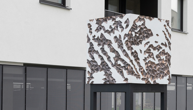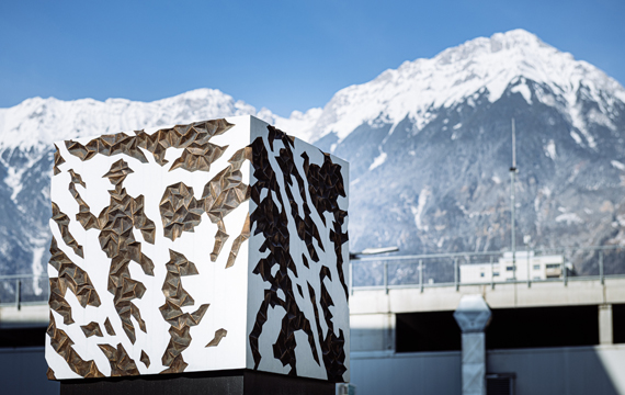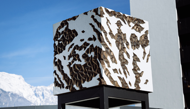 Im Sinne nachhaltigen Handelns als langlebiger Bronzeguss ausgeführt, erscheint die Skulptur als kubischer Körper in dessen weiß lackierte Mantelfläche ein negatives Relief eingeschnitten ist, das die patinierte Bronze freilegt. Verwitterungsspuren an der weißen Lackierung, die im Laufe der Zeit auftreten werden, sind beabsichtigter Bestandteil der Skulptur als sichtbare Zeichen der Veränderlichkeit der Welt, die uns umgibt.