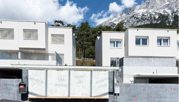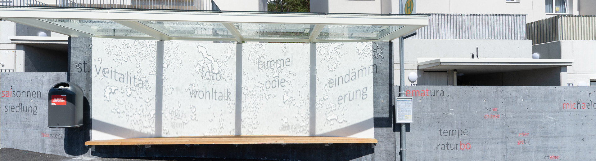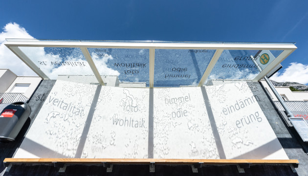 Die Wartenden und Ankommenden auf die bevorzugte Sonnenlage des Wohngebietes oberhalb der Marktgemeinde Telfs und seine besondere Atmosphäre aufmerksam machen – das will die WortKunst-Unterhaltestelle Telfs-Sonnensiedlung.